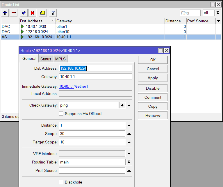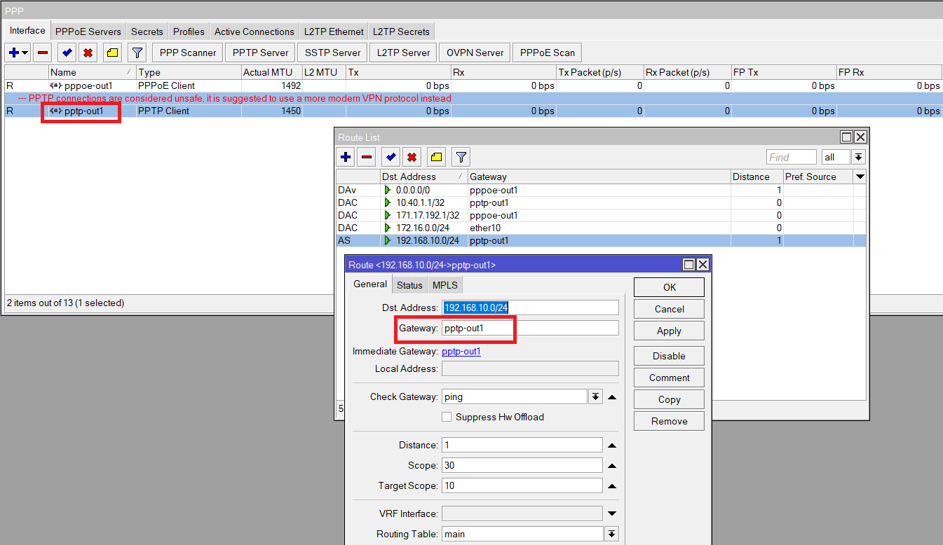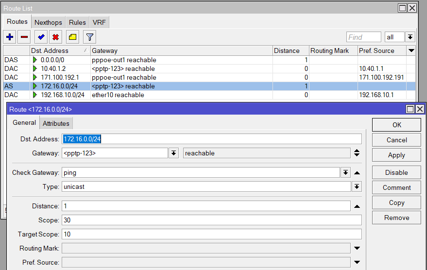 Việc bổ sung định tuyến tĩnh trên RouterOS v6 khá dễ dàng, bằng cách sử dụng tên cổng được sử dụng là giao diện VPN (PPTP) hoặc có thể sử dụng địa chỉ VPN đích của bộ định tuyến phía đầu kia.