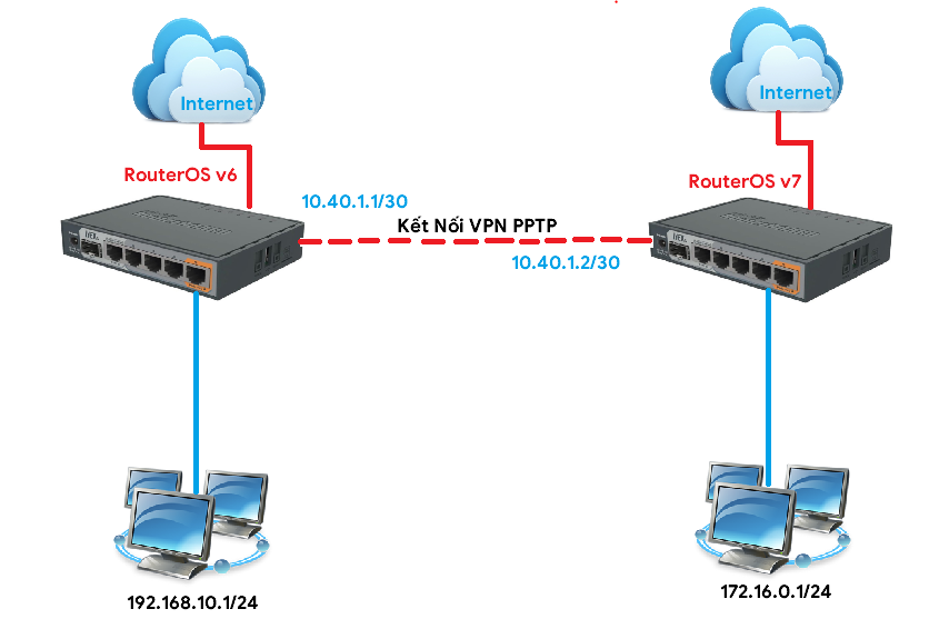 Đối với cấu trúc liên kết thứ hai, chúng tôi sử dụng VPN, cụ thể là PPTP để kết nối giữa Router1 và Router2 thông qua internet.
